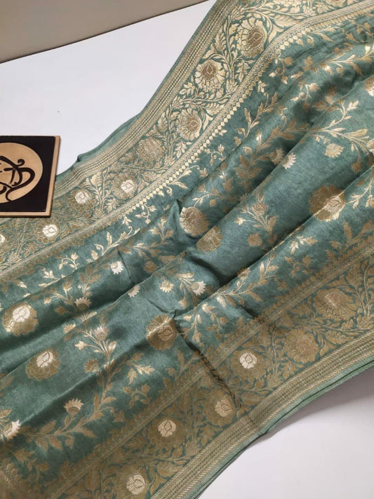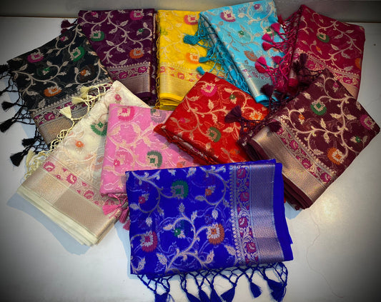 Welcome to our exclusive collection of Banarasi Khaddi Chiffon Sarees, where tradition meets modern elegance. Handcrafted with precision and adorned with intricate motifs, each saree captures the essence of Banaras's rich cultural heritage. These sarees are a celebration of not just fabrics, but classic sophistication and finesse.