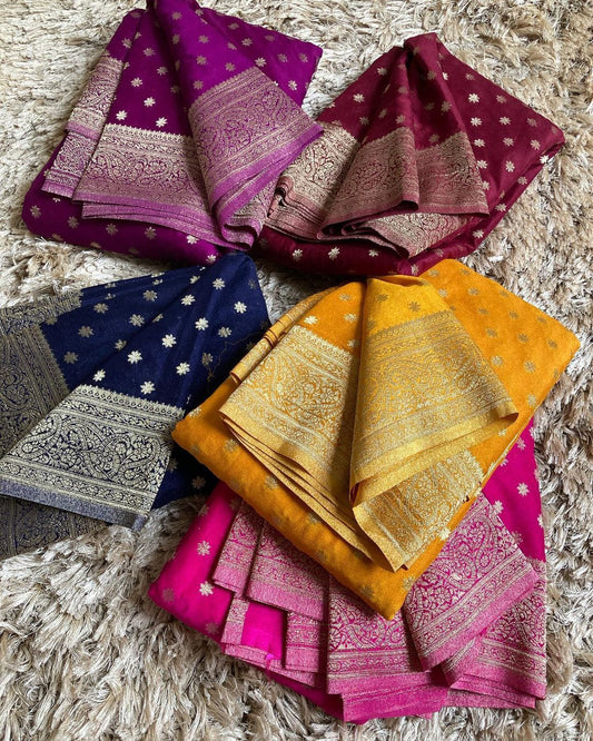 The range of styles in our collection is one of its most notable aspects. Our Banarasi Khaddi Chiffon Sarees come in a spectrum of colors and designs, catering to every taste and preference. From bold, vibrant hues that make a statement to subtle, pastel shades that exude understated elegance, there is something for everyone. These versatile styles allow you to express your unique personality and style, making them a perfect addition to your wardrobe.