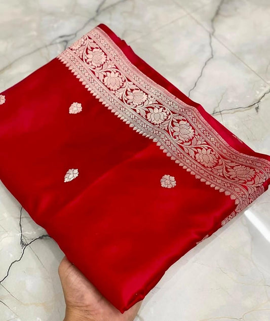 Experience the captivating allure of Banarasi Katan Silk sarees, a true embodiment of grace, elegance, and luxury. These sarees, made from pure silk, possess a lustrous sheen and a rich texture that beautifully drapes, creating a mesmerising silhouette.Our collection of Katan Silk sarees showcases the timeless charm and sophistication of this exquisite fabric. Each saree is meticulously woven with precision and care, reflecting the rich heritage of skilled craftsmanship. With intricate motifs and delicate patterns, every design narrates a story of artistry and tradition.