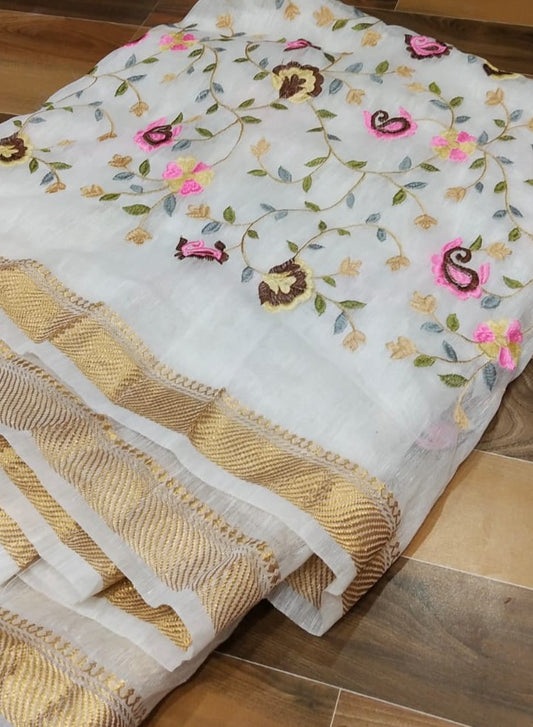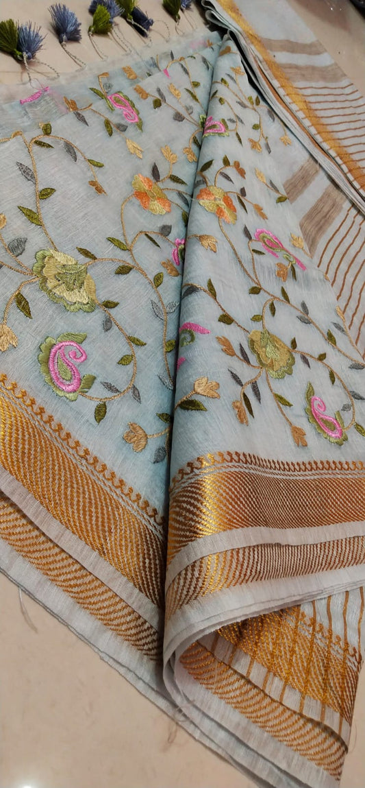 Pure Linen Silk Hand Embroidery Work Saree With Blouse.