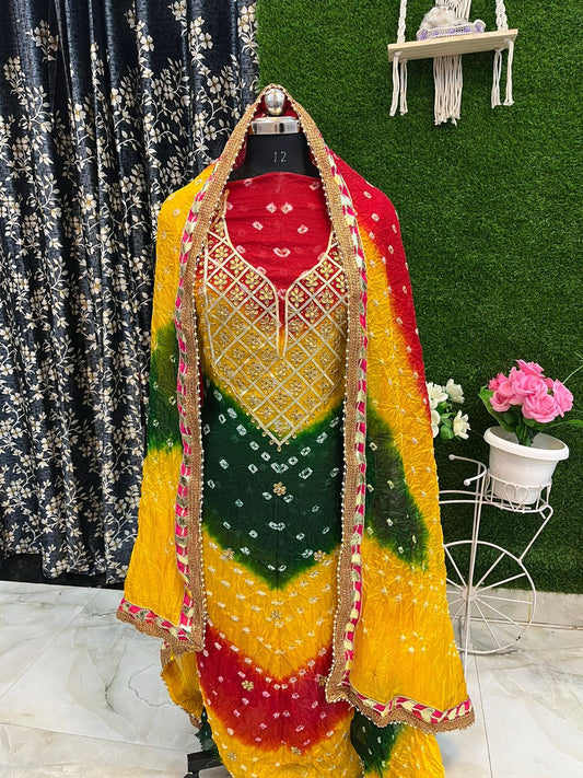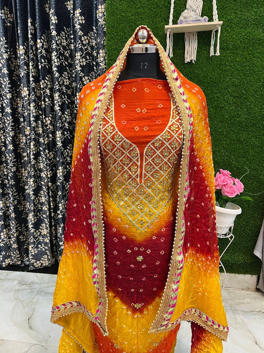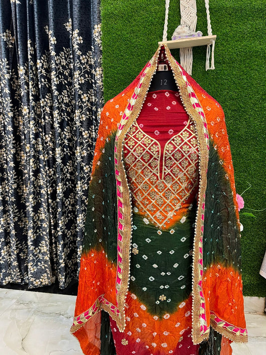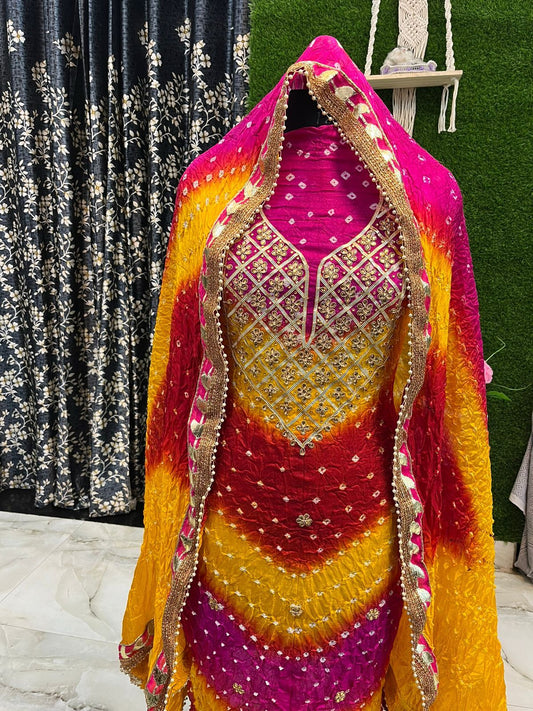 Rajasthani Gota Patti suits are exquisite traditional outfits that originated in the state of Rajasthan, India. These suits are adorned with intricate Gota Patti work, which is a traditional embroidery technique using gold or silver ribbon-like strips known as "gota." The gota strips are meticulously stitched onto the fabric to create beautiful patterns and designs.