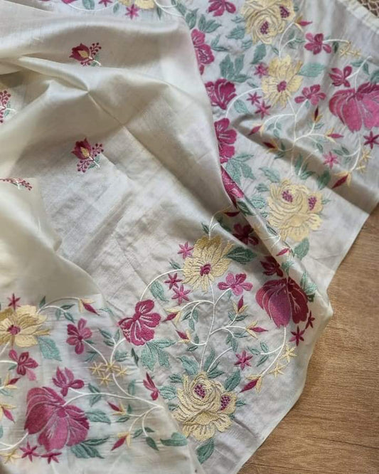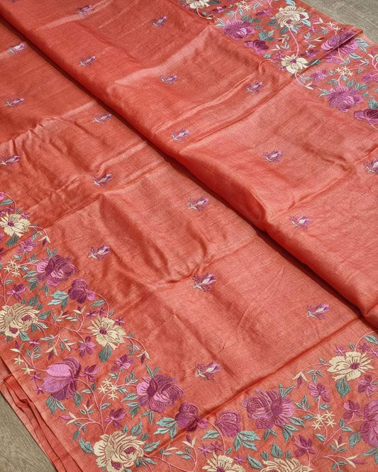 Pure Tussar- Moonga Hand Embroidered Saree With Running Blouse
