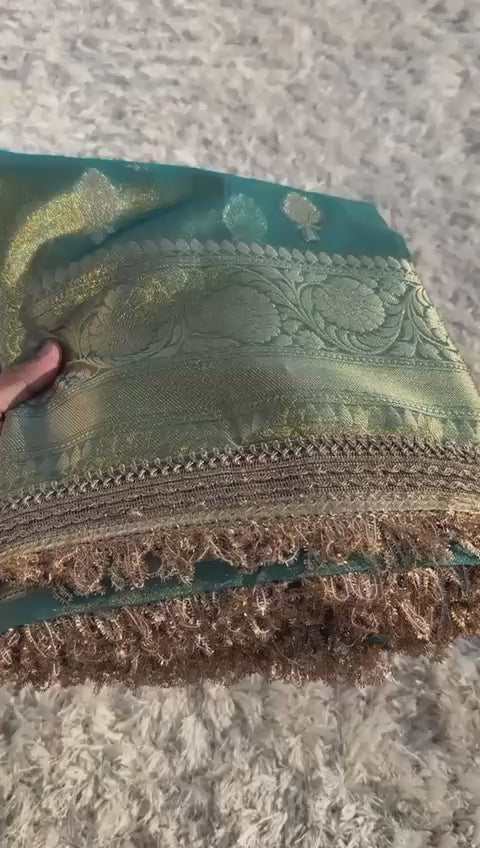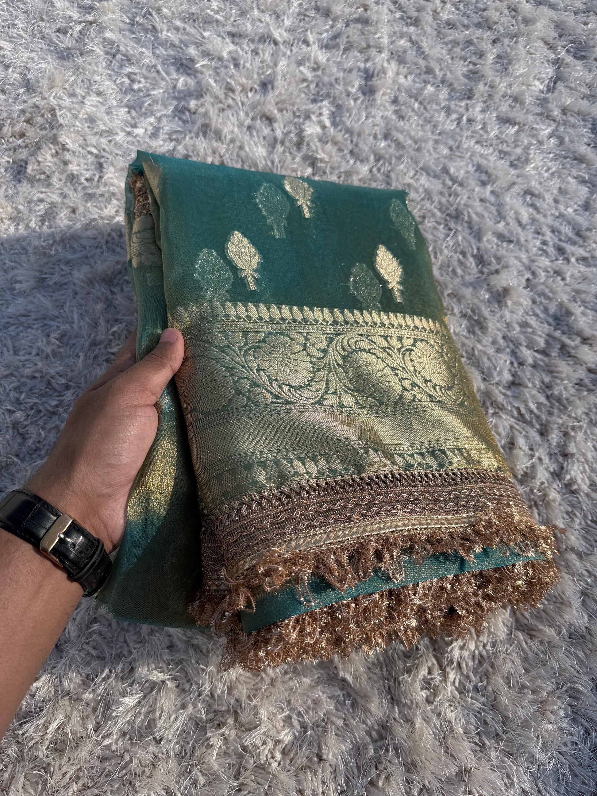 This Banarasi Tissue Silk Heavy Lace Saree is crafted with luxurious and delicate silk fabric. The traditional Banarasi weaving technique adds a touch of elegance and sophistication. The heavy lace work on this saree enhances its beauty, making it a perfect choice for special occasions.