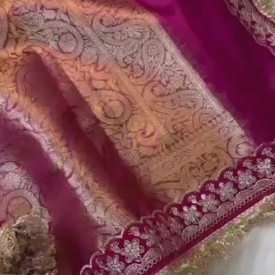 This Banarasi Tissue Silk Heavy Lace Saree is crafted with luxurious and delicate silk fabric. The traditional Banarasi weaving technique adds a touch of elegance and sophistication. The heavy lace work on this saree enhances its beauty, making it a perfect choice for special occasions.