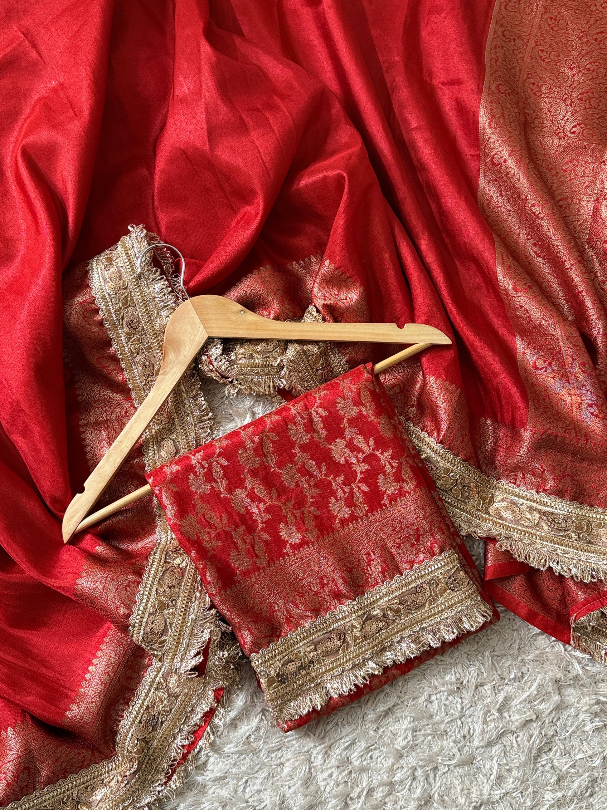 This Banarasi Tissue Silk Heavy Lace Saree is crafted with luxurious and delicate silk fabric. The traditional Banarasi weaving technique adds a touch of elegance and sophistication. The heavy lace work on this saree enhances its beauty, making it a perfect choice for special occasions.