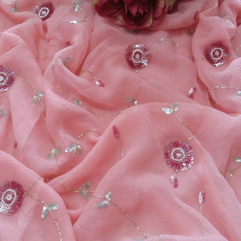 - Crafted with pure chiffon fabric, this beautiful Jaipuri saree features intricate sequence Jaal work that adds a touch of elegance to your style. With its lightweight and delicate texture, this saree is perfect for special occasions and will surely make you stand out.