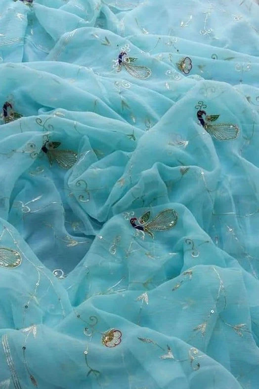 - Crafted with pure chiffon fabric, this beautiful Jaipuri saree features intricate sequence Jaal work that adds a touch of elegance to your style. With its lightweight and delicate texture, this saree is perfect for special occasions and will surely make you stand out.