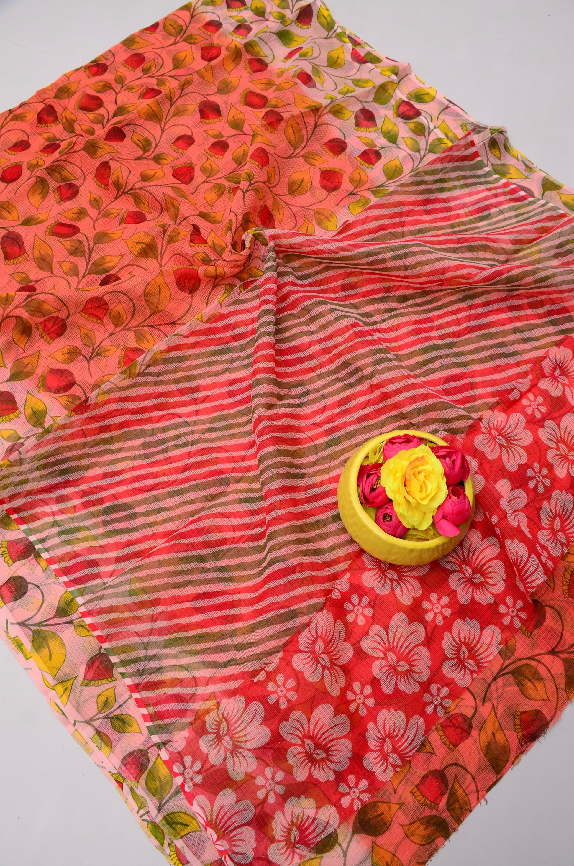 Pure Cotton Kota Doria Kalam Kari Floral Print Saree
