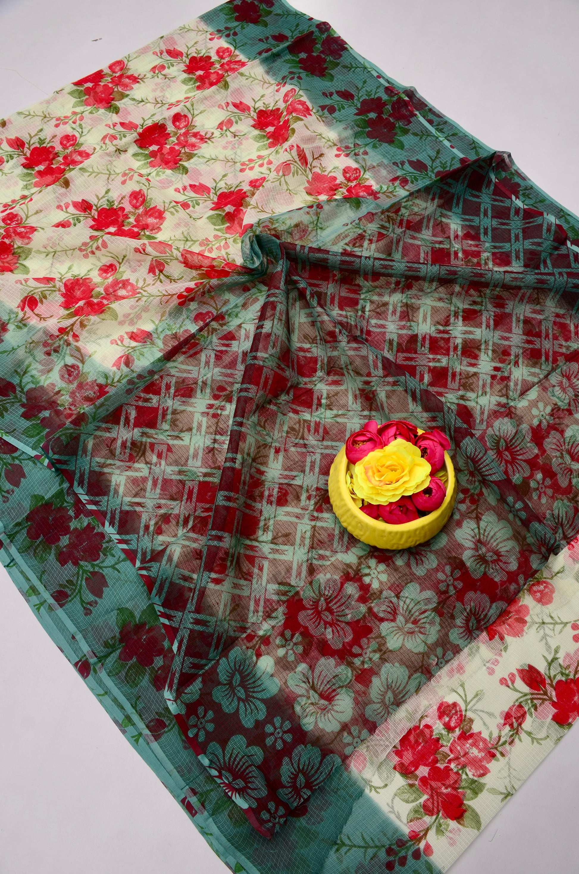 Pure Cotton Kota Doria Kalam Kari Floral Print Sarees