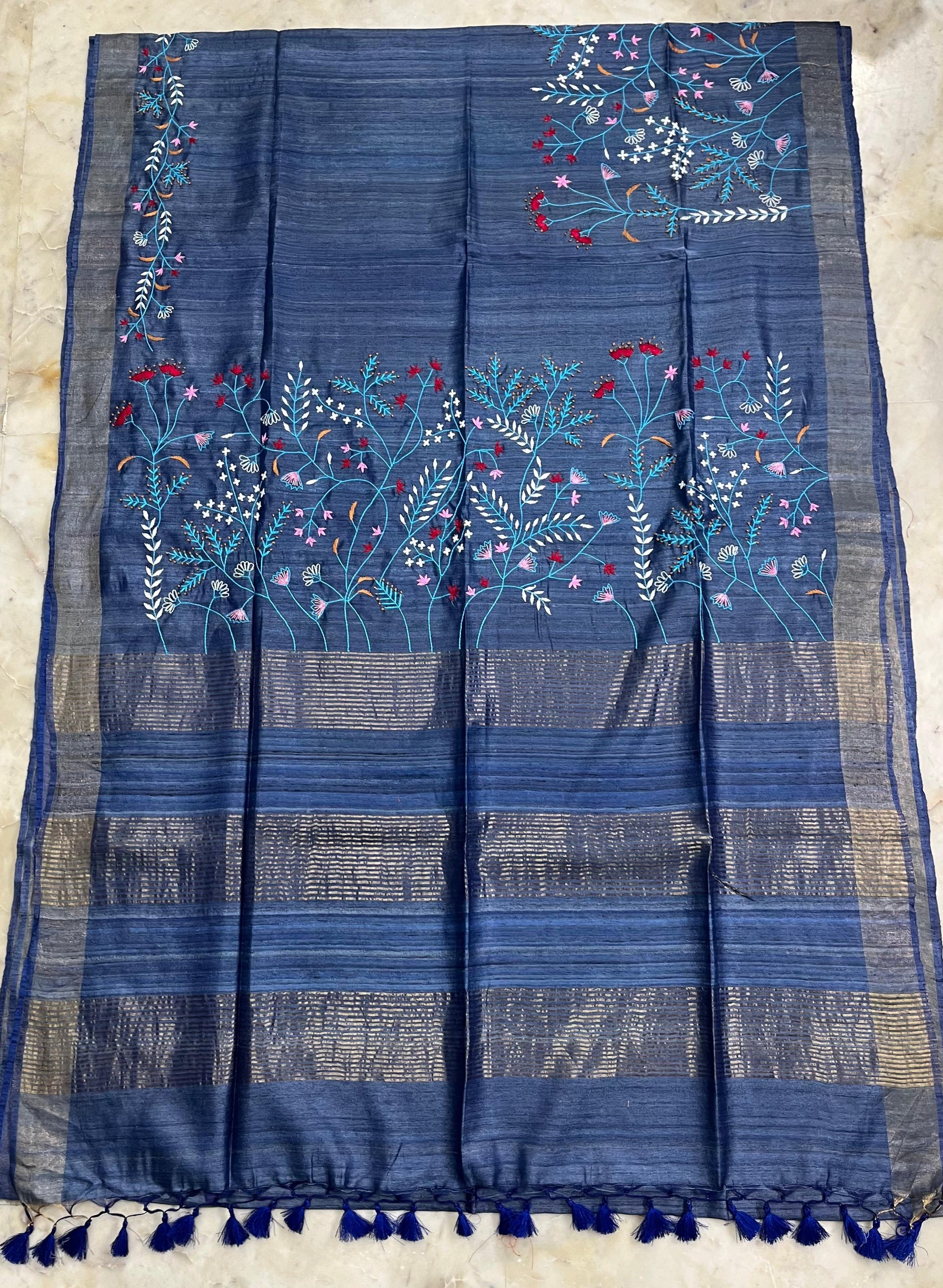 Pure Desi Tussar By Tussar Silk Embroidery Work Saree With Running Blouse