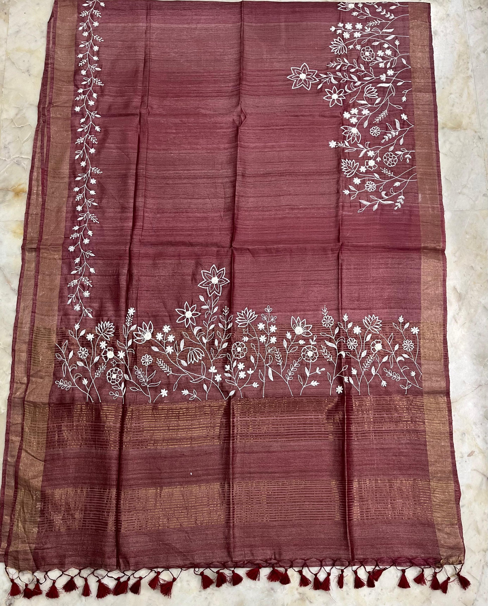 Pure Desi Tussar By Tussar Silk Embroidery Work Saree With Running Blouse