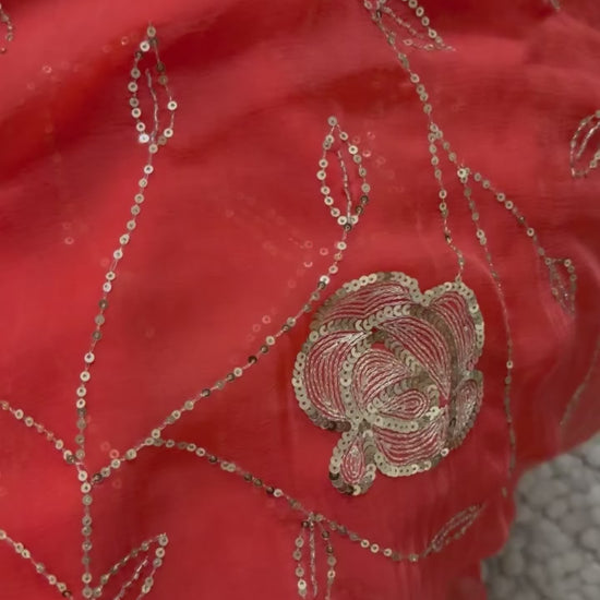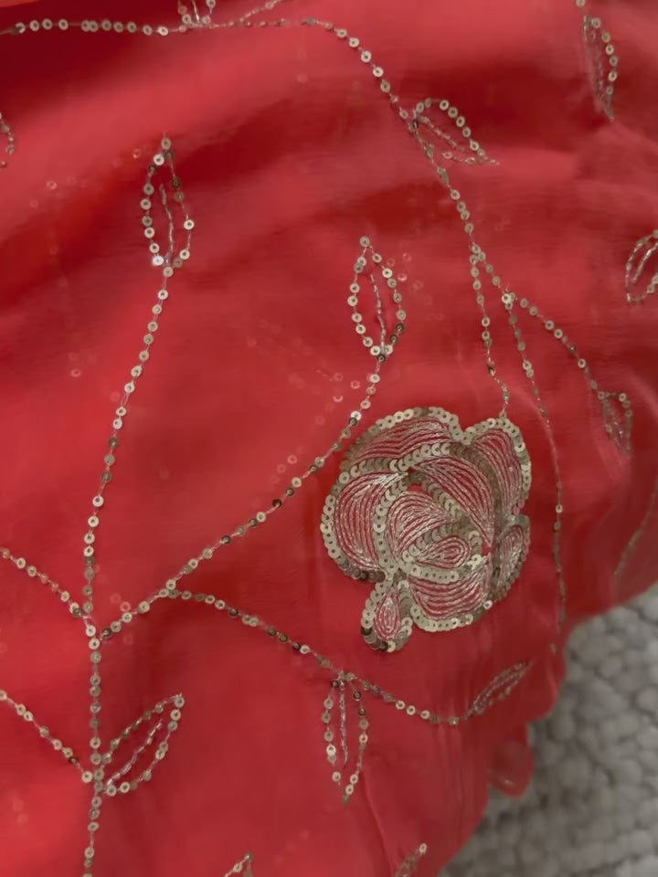 - Crafted with pure chiffon fabric, this beautiful Jaipuri saree features intricate sequence Jaal work that adds a touch of elegance to your style. With its lightweight and delicate texture, this saree is perfect for special occasions and will surely make you stand out.
